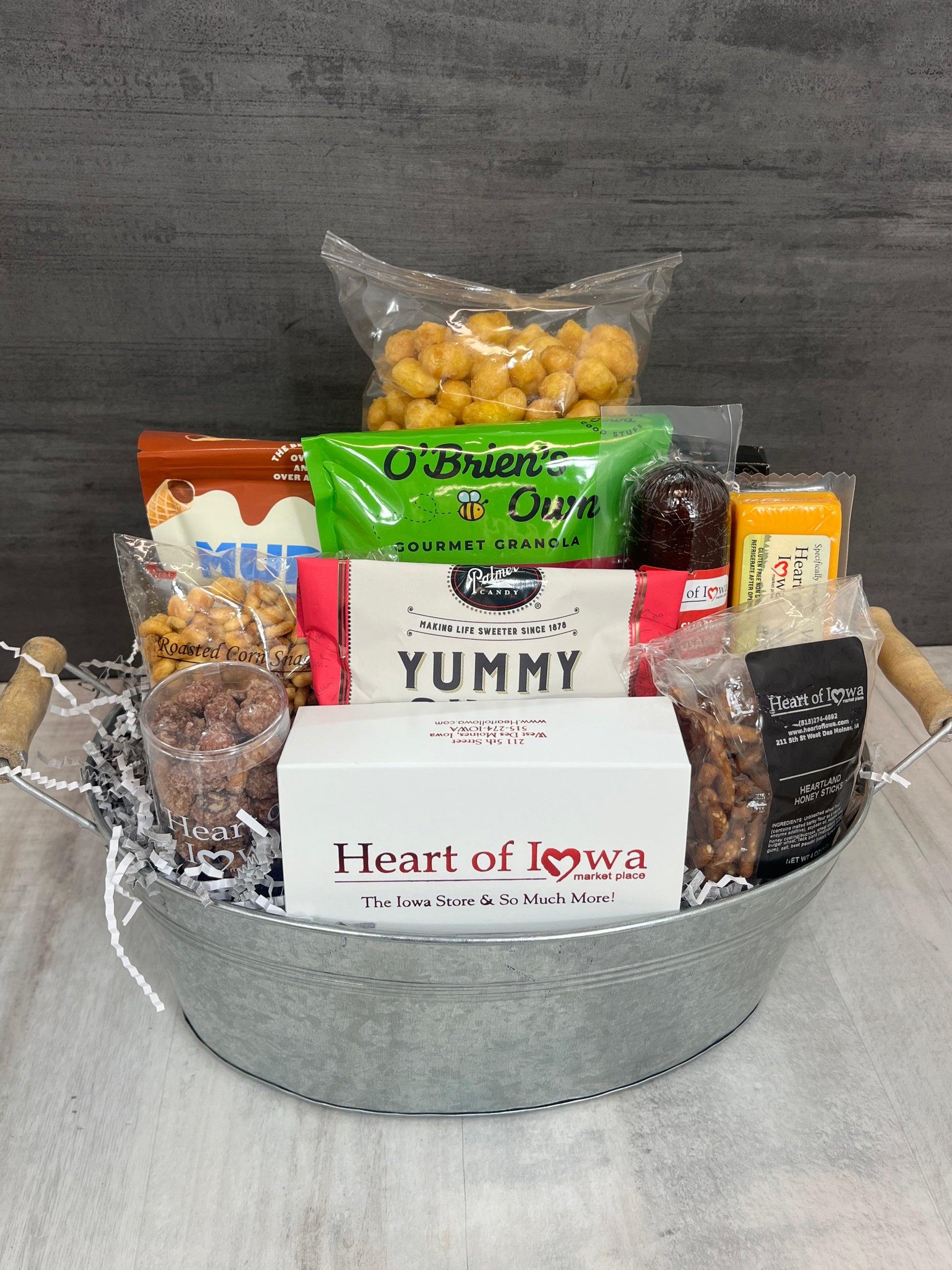 Esta canasta lo tiene todo: muchos bocadillos fáciles de compartir, tanto dulces como salados.